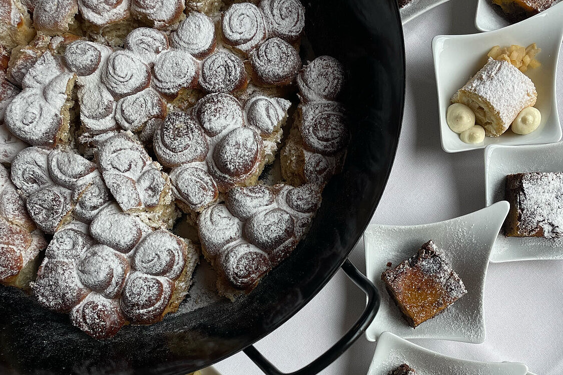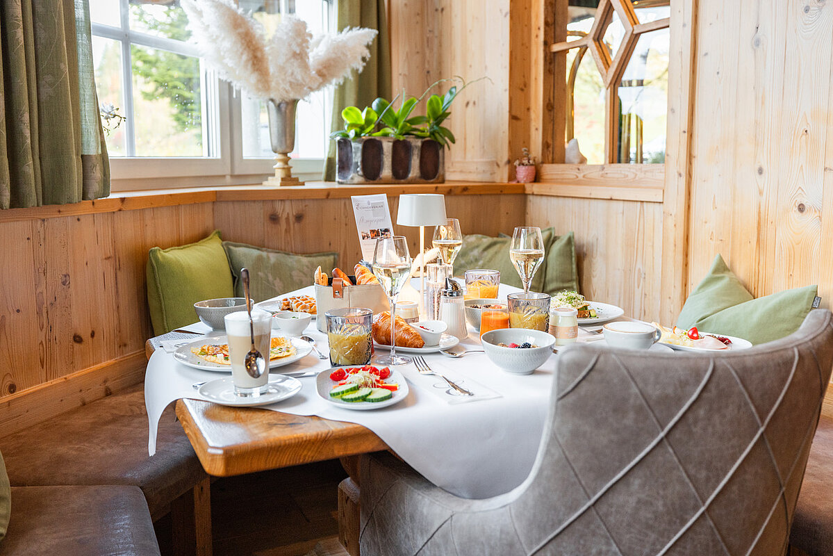 Euch erwartet ein reichhaltiger Brunch vom Buffet mit allem, was das Genießerherz begehrt: ein vollständiges Genussfrühstück, saisonal wechselnde warme und kalte Köstlichkeiten sowie Softdrinks, frische Säfte, Kaffeespezialitäten, erlesene Tees und Prosecco.